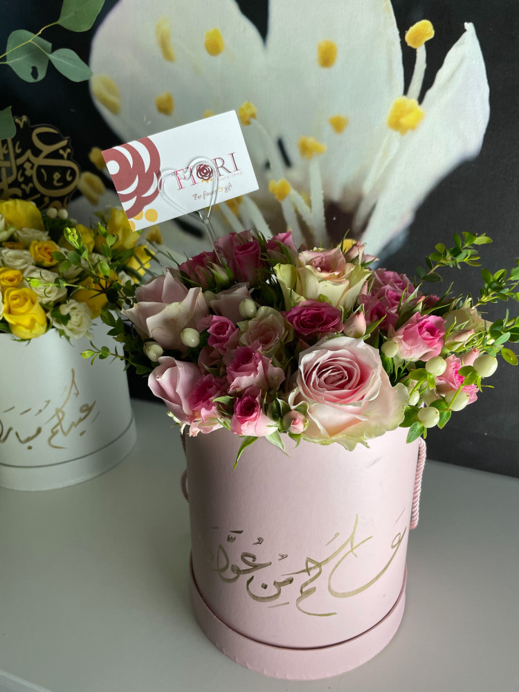 صندوق صغير منسق بالورد الطبيعي مع امكانية كتابة عبارة بالخط العربي